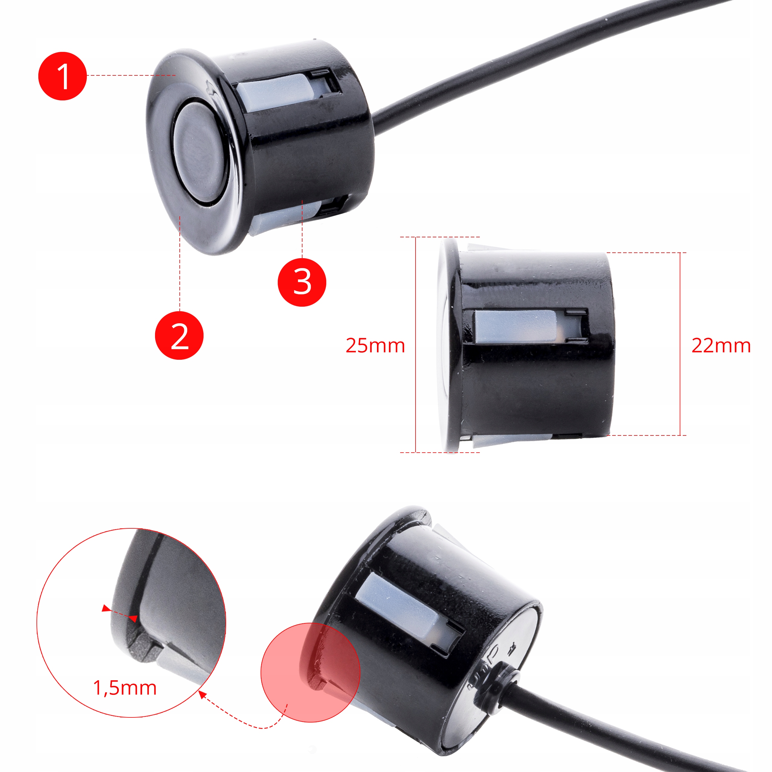 Rozkręcane sensory jak te stosowane na pierwszy montaż w samochodach seryjnych. Przyśpiesza i ułatwia to proces montażu w samochodzie. W przypadku uszkodzenia sensora (np. stłuczka) nie ma konieczności zdejmowania zderzaka – wyjmujemy sensor, odkręcamy go i wymieniamy.