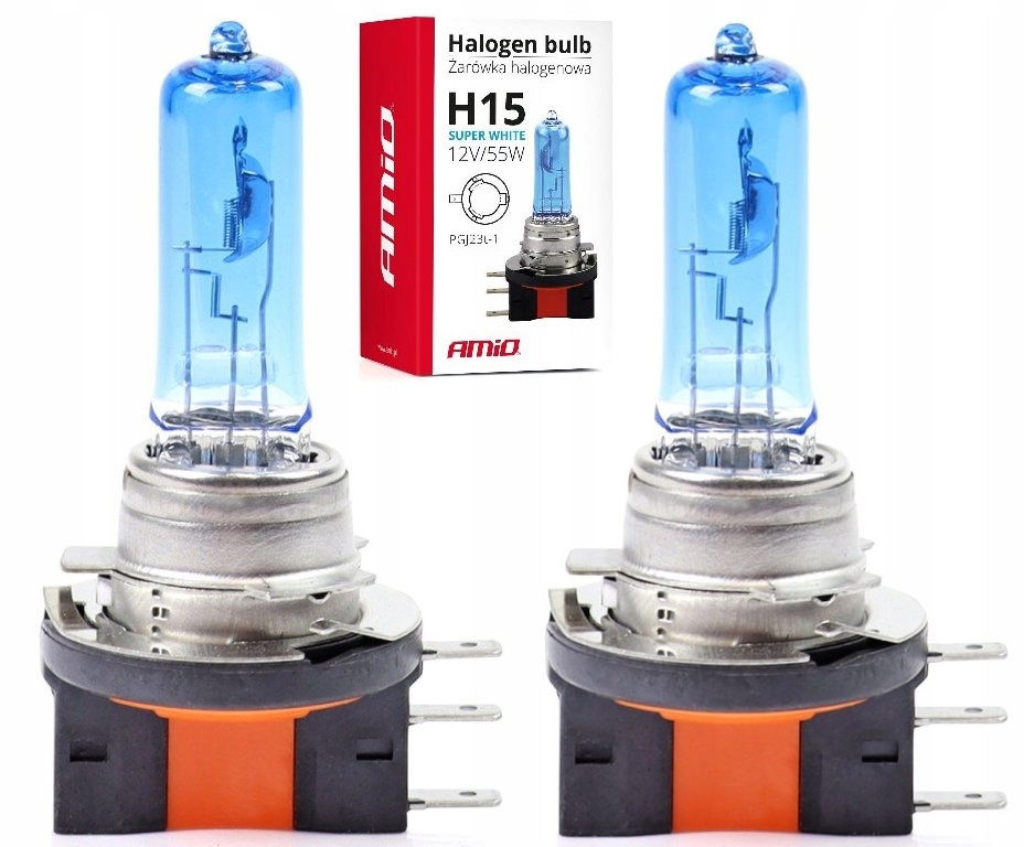 Dwuwłóknowa halogenowa żarówka firmy Amio o oznaczeniu H15 to żarówka, która używana jest w przednim oświetleniu pojazdu. Jest to model standardowy, który z powodzeniem montowany jest w nowych autach (Volkswagen, Audi, Skoda). Dodatkową cechą tej żarówki jest to, że przez cały okres eksploatacji ilość i jakość światła, jakie wytwarza nie ulega zmianie. Jej moc znamionowa wynosi 15 watów dla jednego włókna i 55 watów dla drugiego. Typ gniazda mocującego to PGJ23t-1.