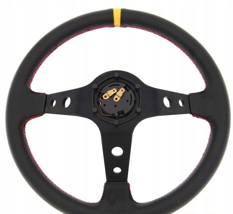 Kierownica wykonana z wysokiej jakości materiałów. W zestawie klakson, śrubki montażowe, przewody do podłączenia klaksonu i naklejka na klakson z logiem producenta. Rozstaw śrub standardowy, czyli 6 otworów co 35mm jak MOMO/Sparco.