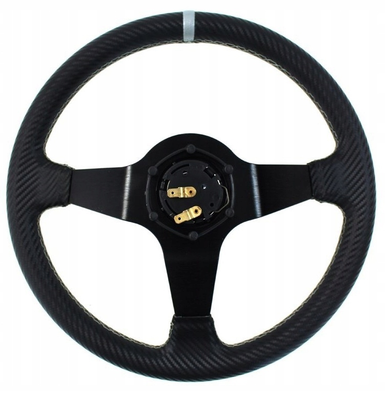 Kierownica wykonana z wysokiej jakości materiałów. W zestawie klakson, śrubki montażowe, przewody do podłączenia klaksonu i naklejka na klakson z logiem producenta. Rozstaw śrub standardowy, czyli 6 otworów co 35mm jak MOMO/Sparco.