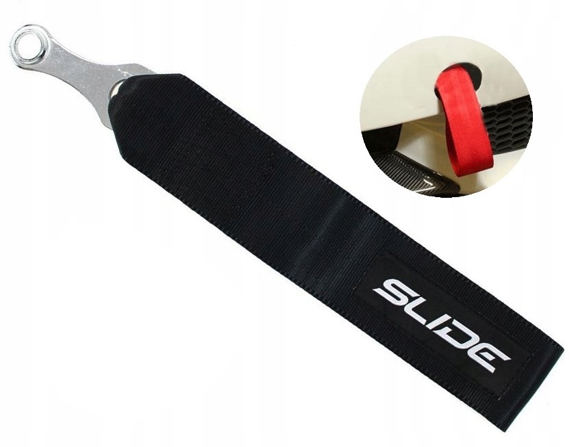 Materiałowy zaczep holowniczy. Według nas z przeznaczeniem bardziej jako gadżetu lub doraźnym użyciem aniżeli do regularnego praktycznego zastosowania.