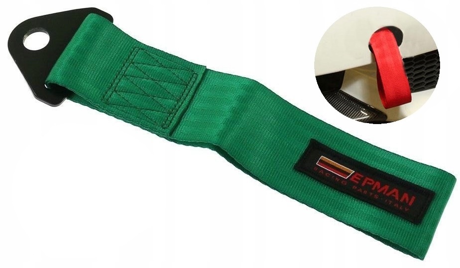 Materiałowy zaczep holowniczy. Według nas z przeznaczeniem bardziej jako gadżetu lub doraźnym użyciem aniżeli do regularnego praktycznego zastosowania.
