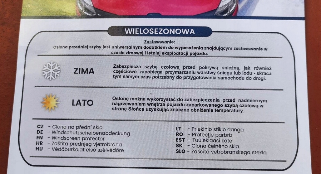 Latem doskonale izoluje wnętrze pojazdu przed nadmiernym nagrzewaniem się, a zimą zabezpieczy szybę auta przed warstwą lodu oraz śniegiem.